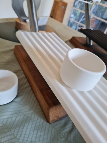 Design-Etagere aus Holz & Edelstahl – handgefertigtes Statementstück. Diese außergewöhnliche Etagere verbindet modernes Design mit traditioneller Handwerkskunst. Klare Linien aus gebürstetem Edelstahl treffen auf einen massiven Holzsockel – ein spannender Kontrast, der jede Tafel aufwertet und sofort ins Auge fällt. Die schwebend wirkenden Ebenen bieten stilvollen Platz für Canapés, Pralinen, Käse, Antipasti oder feines Gebäck. Ob beim festlichen Empfang, im gehobenen Gastronomiebereich oder als exklusives Wohnaccessoire: Diese Etagere setzt Ihre Speisen gekonnt in Szene. Porzellanteller in schwarz oder weiß erhältlich. ✨ Besonderheiten auf einen Blick: - Handgefertigt mit Liebe zum Detail - Edle Kombination aus Massivholz, Porzellan und Edelstahl - Modernes, zeitloses Design - Stabiler Stand und hochwertige Verarbeitung - Ideal für Feiern, Events, Gastronomie oder besondere Anlässe - Diese Etagere ist mehr als ein Servierstück – sie ist ein Designobjekt, das Genuss und Ästhetik vereint. Für Menschen, die Wert auf Qualität, Individualität und Stil legen.