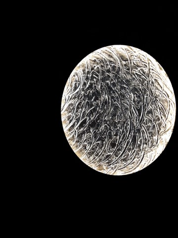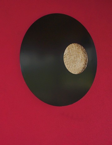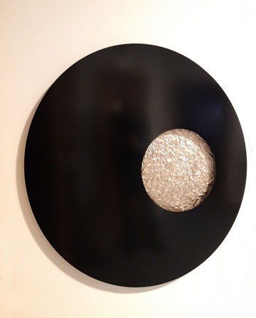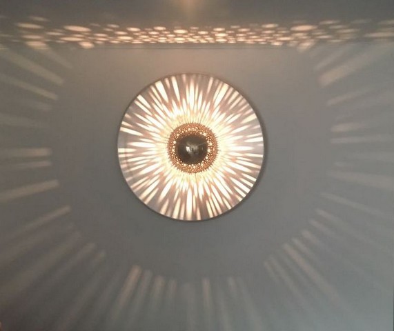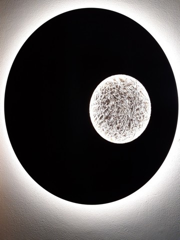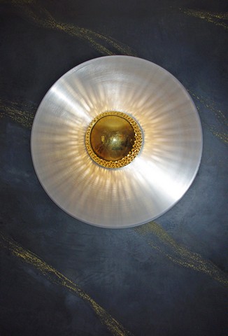 Magie in Licht und Schatten. Einzigartiges Leuchtobjekt aus tiefgezogener, mit Spezialschliff versehender Aluminiumscheibe ca.1,0m oder 1,4m Durchmesser. Die Halb-Kugeln ( aus Keramik) sind in verschiedenen Glasuren (gold, antrazit, weiss, goldbronze) erhältlich.