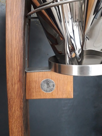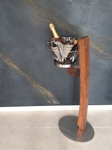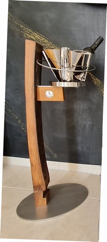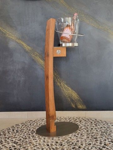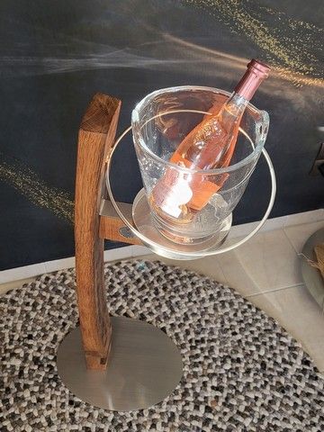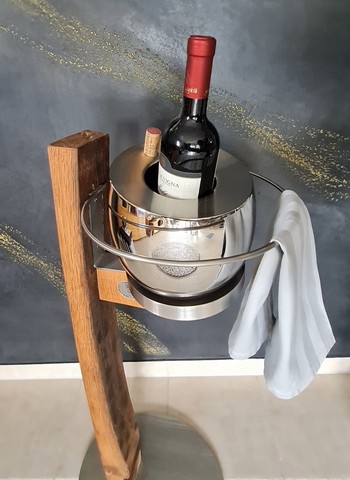 einzigartiger Wein/Sektkühler aus Glas oder gefaltetem oder auch geformten, doppelwandigem Edelstahl, wird gehalten durch Fassdaube aus Barrique Eichenholz.