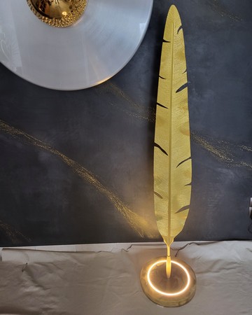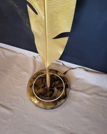 dieses einzigartige beleuchtete Kunstobjekt verbindet rohe Materialien mit feiner Symbolik: Eine senkrecht stehende Feder aus Aluminium, veredelt mit Goldfarbe, wächst aus einer massiv gegossenen Epoxidharzplatte empor. Sanftes Licht bringt die goldene Oberfläche zum Leuchten und verleiht dem Objekt eine fast schwebende Präsenz. Details: Gesamthöhe 160cm, Sockel Epoxidharz D=35cm, 5cm hoch Ein Statement für Räume mit Charakter - ob Loft, Galerie, Empfangsbereich oder privates Interior. Elegant, Kraftvoll. Stil.