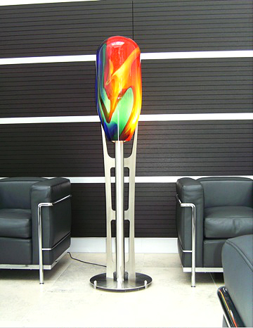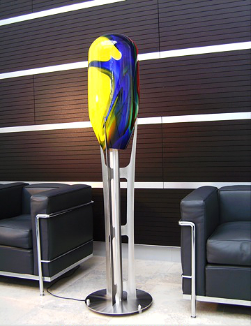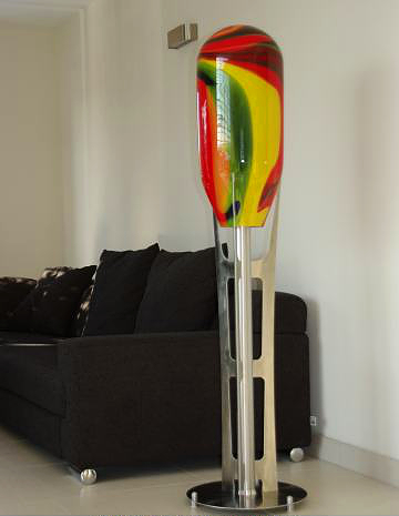 Glasballon-Stehlampe mit original mundgeblasenem Glasballon. Die Höhe der Lampe beträgt ca. 160 cm und der Durchmesser ca. 40 cm.